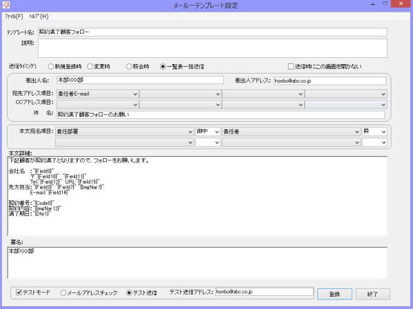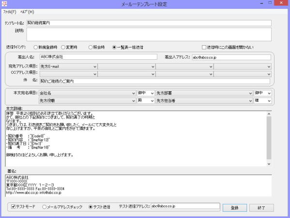 ・例えば、期限満了予定契約に対して、任意のタイミングで契約先担当者宛に一括送信することができます。
