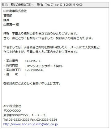 ・例えば、期限満了予定の契約について、契約責任者宛へのフォローアップ依頼等のメールを送信することができます。