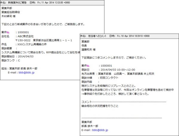 ・新規商談の報告メールや、上司から担当者へのコメントメールなどもテンプレート化し、適切なタイミングで自動送信することができます。